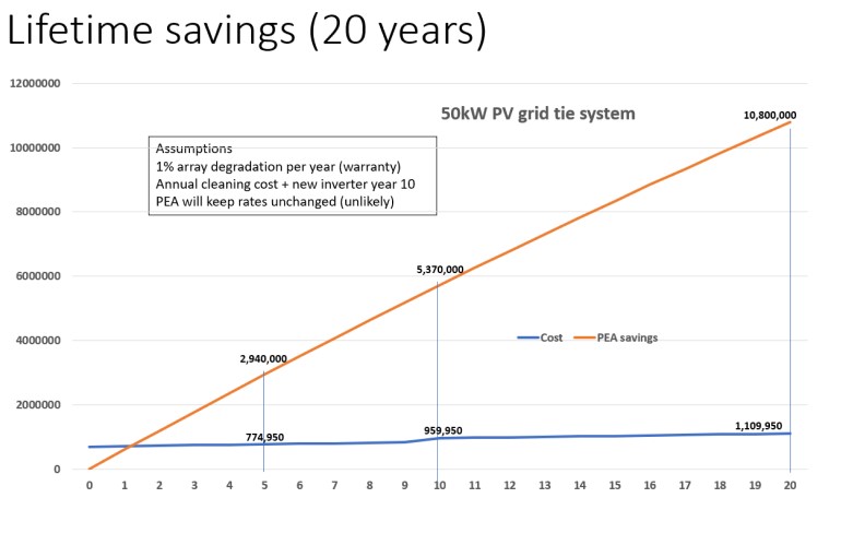 This system can supply your daytime usage and feed back excess power to PEA . Depending on your meter type, you can receive a 100% credit from PEA for excess power sent to PEA. System is entirely modular, and can be doubled or tripled as demand increases